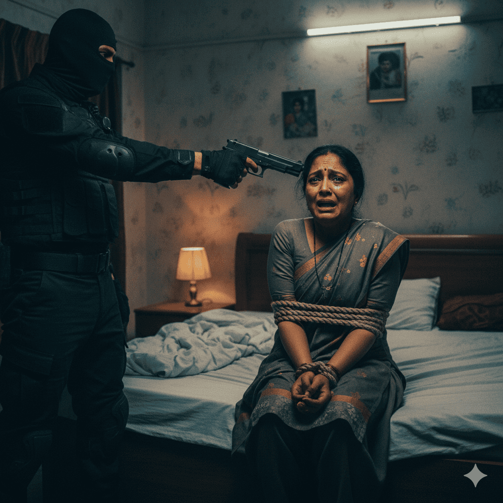 مرت عشرون دقيقة تتحرك سيارة الشرطة في شوارع دبي .. وسانجاي ينفخ في زهقًا وضيقًا وهو يُراقِبُ ضباطي الشرطة وهما يتسامران ولا يعبآن به .. وصلت سيارة الشرطة بالنهاية إلى أحد المنازل الخاصة، وتوقَّفت أمام باب المنزل ..فترجَّل الشرطيين من السيارة وفتحا الباب لسانجاي وأنزلوه منها، وهنا صُدم سانجاي بشدة عندما شاهَدَ المنزل الذي توقَّفا أمامه .. فإن هذا المنزل هو منزله .. وتعجَّب لِمَ جعلته الشرطة يعود إلى منزله .. فحدثهما مندهشًا .. “لماذا عدنا إلى المنزل يا سيدي .. ؟” .. لم يرد عليه الشرطي، واكتفى بأن سحبه بقوة من ذراعه ودخلا من باب المنزل .. ثم سحباه إلى داخل المنزل وصعدا به إلى أعلى، إلى غرفة نومه .. واندهش بشدة كيف علمت الشرطة ما بداخل منزله، وعلمت مكان غرفة نومه .. لحظات قليلة وكان بدخل غرفة نومه ليجد زوجته وابنه الصغير ذا الحادية عشرة عامًا يجلسان على السرير وهما يبكيان ورجلًا ملثمًا بجوارهما يرفع سلاحًا ناريًّا عليهما وهما مُكبَّلان .. صرخ سانجاي في الحال على زوجته وولده وهما يبكيان بشدة ويحدثانه باللغة الهندية .. فرفع الشرطيان سلاحهما الناري على رأس سانجاي وحدثاه بلهجةٍ حادة .. “أنت الآن وزوجتك وولدك رهائن تحت يدنا .. إذا لم تفعل ما سنأمرك به .. فسوف نقضي على ولدك وزجتك .. ؟” .. فصرخ سانجاي وهو يحتضن ولده وزوجته بخوف .. ” لا .. لا .. سوف أفعل أي شيء تطلبانه مني .. ولكن لا تؤذيا عائلتي أرجوكما .. ” .. فسحب الشرطيان سانجاي بقوة وعنف وهو يتشبث بزوجته وابنه .. اللذين بدآ يصرخان خوفًا من أن يتركهما .. هبط سانجاي ومرافقاه إلى الدور الأول بالمنزل، وحدثاه بجديةٍ وهما يرفعان أسلحتهما على رأسه، وأعطياه هاتفًا .. فحدثهما مترجيًا .. ” ماذا تريدانني أن أفعل .. سأفعل أي شيء .. ولكن أرجوكما لا تؤذيا عائلتي .. ” .. فحدثه الشرطي الأول ..